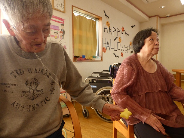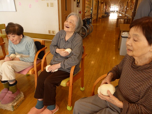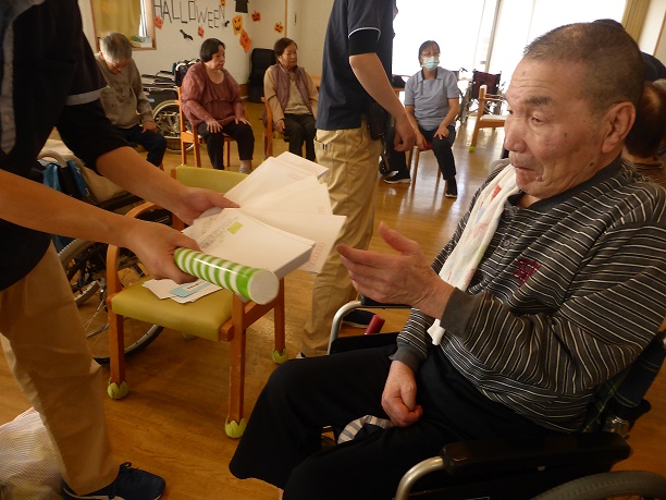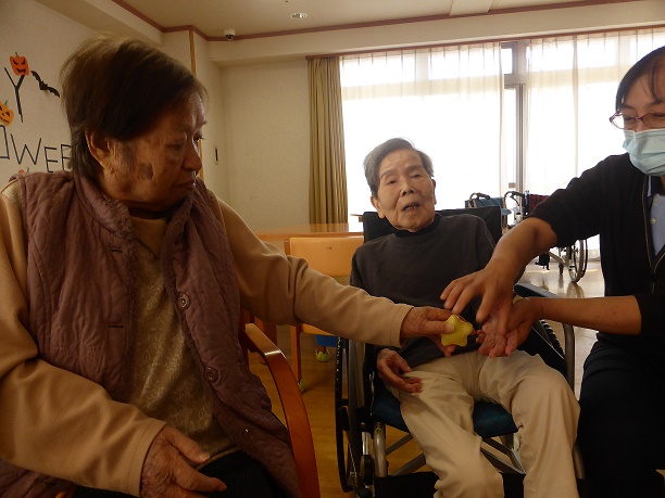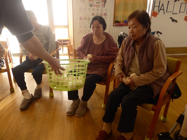 初めは小さい物から隣の方に渡すのですが、これがなかなか難しいようで手が滑って物を落とされる方や上手く隣の方に渡せない方などいらっしゃいましたが、次第に少し大きい物になるにつれて、コツを掴まれたのか皆さま渡すスピードが速くなっています😄