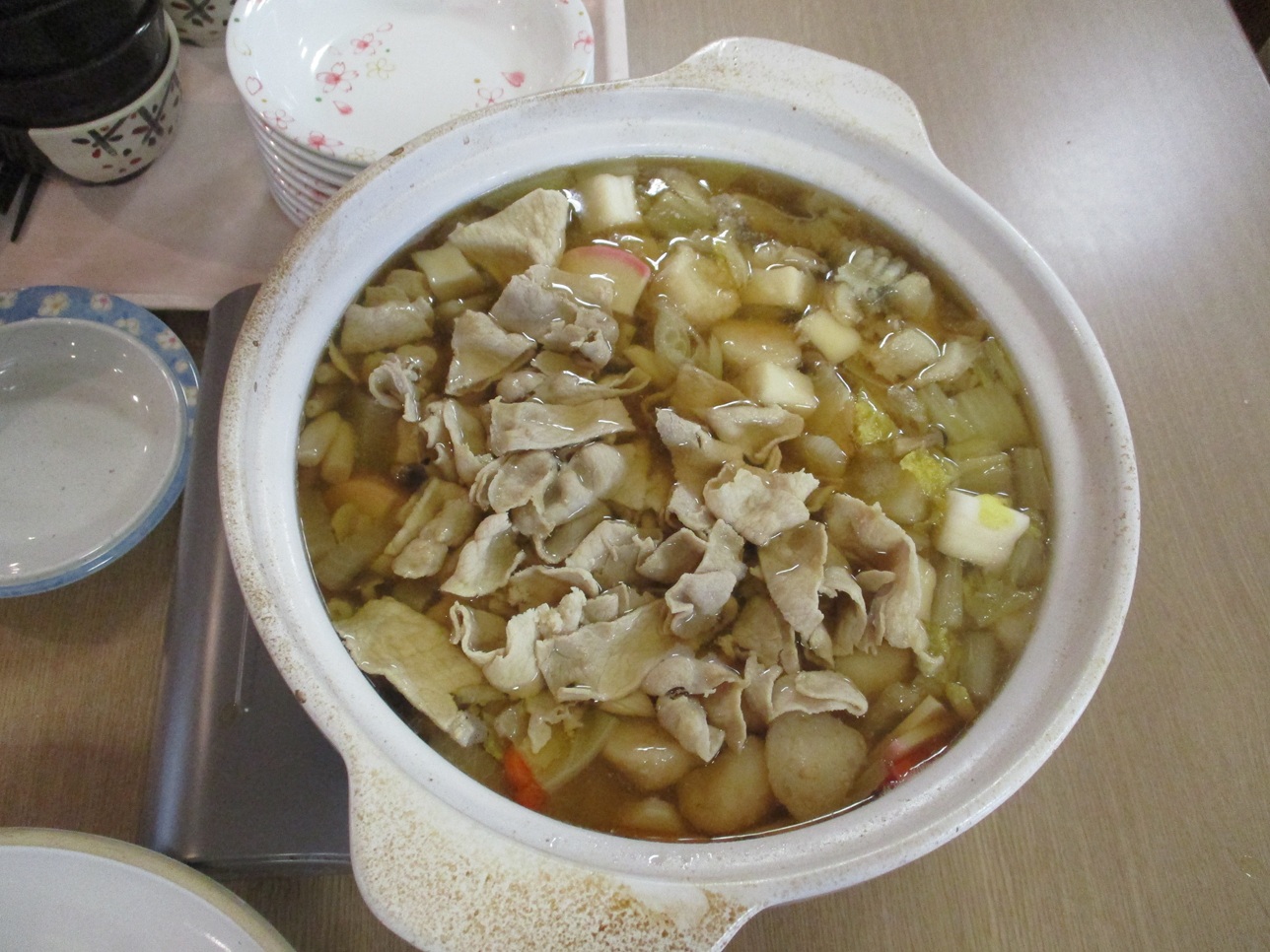 昼食で寄せ鍋を召し上がっていただきました(´~`)モグモグ 皆さん「おいしいな♪」と2~3回おかわりされ、締めの雑炊もたくさん召し上がってお腹いっぱいになっていました(*^-^*)