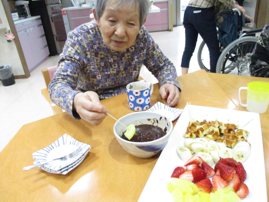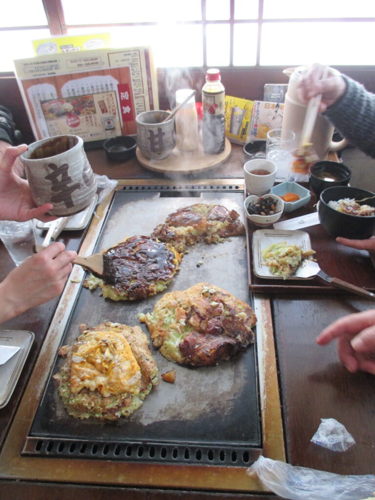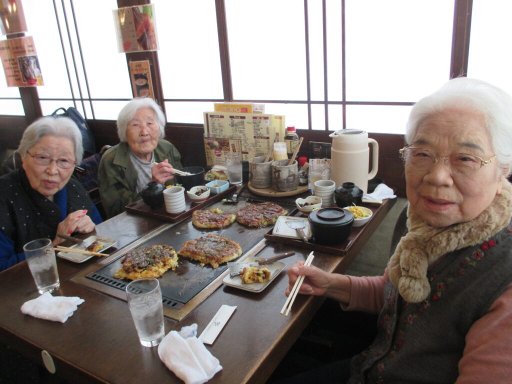 デイサービス3月行事予定(写真はお好み焼き『遇』の外食風景です)