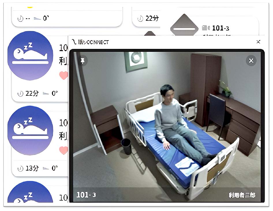 「見守り支援カメラ」は、居室にカメラを設置して映像を記録するとともに、「睡眠計測センサー」が検知したご入居者の状態を映像とともに確認できるシステムです。