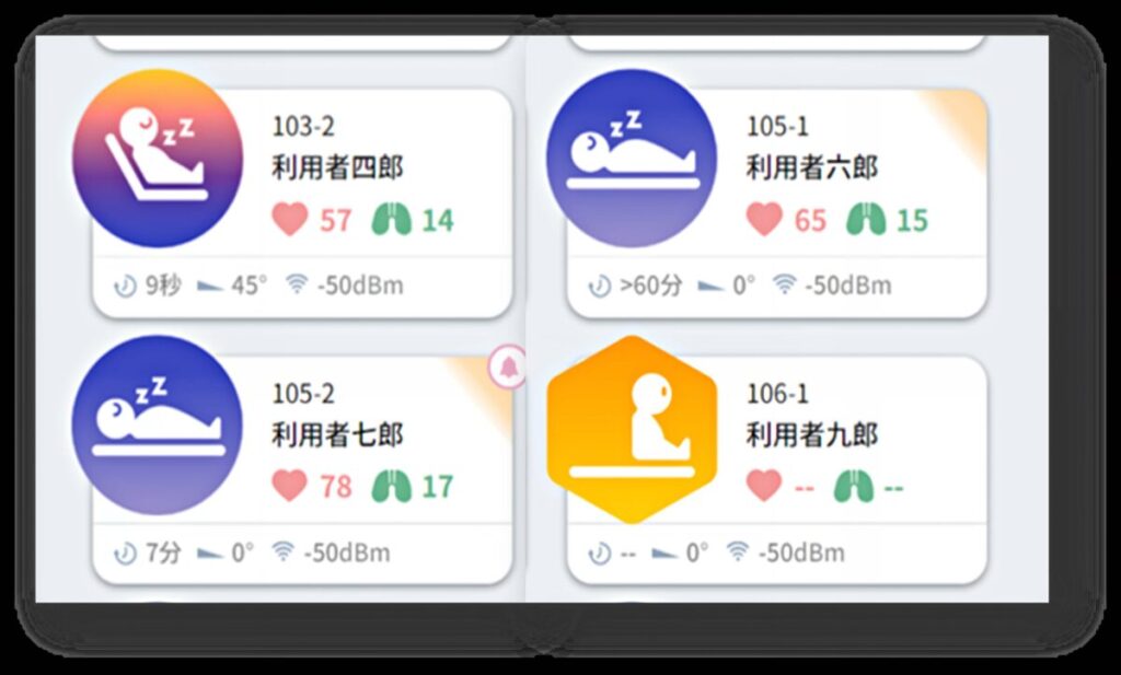 このセンサーを用いた見守り支援システムでは「睡眠、覚醒、起き上がり、離床」の状態や「心拍数、呼吸数(推定値)」を表示することができます。
